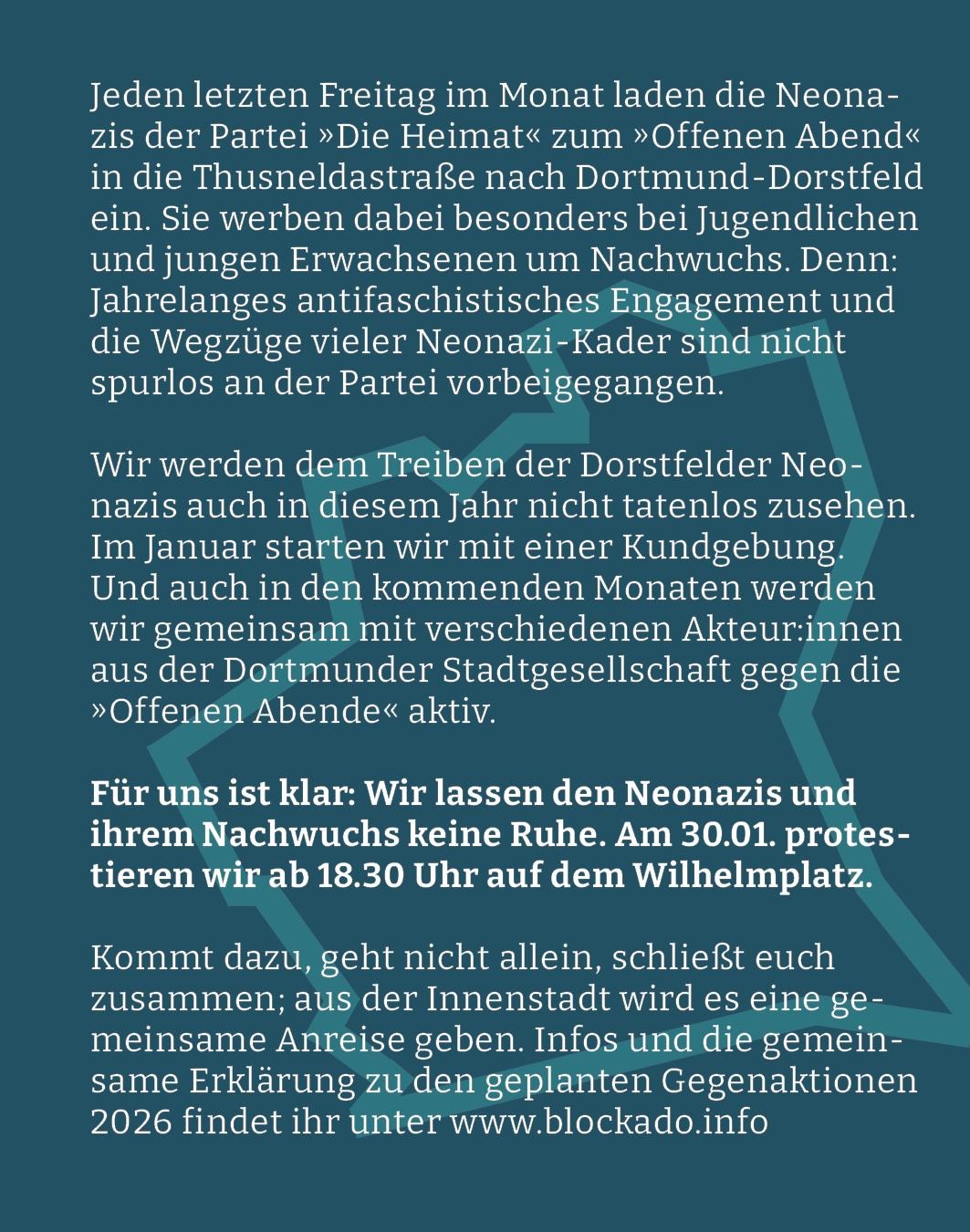 Wir werden dem Treiben der Dorstfelder Neonazis auch in diesem Jahr nicht tatenlos zusehen. Im Januar starten wir mit einer Kundgebung. Und auch in den kommenden Monaten werden wir gemeinsam mit verschiedenen Akteur:innen aus der Dortmunder Stadtgesellschaft gegen die „Offenen Abende“ aktiv.